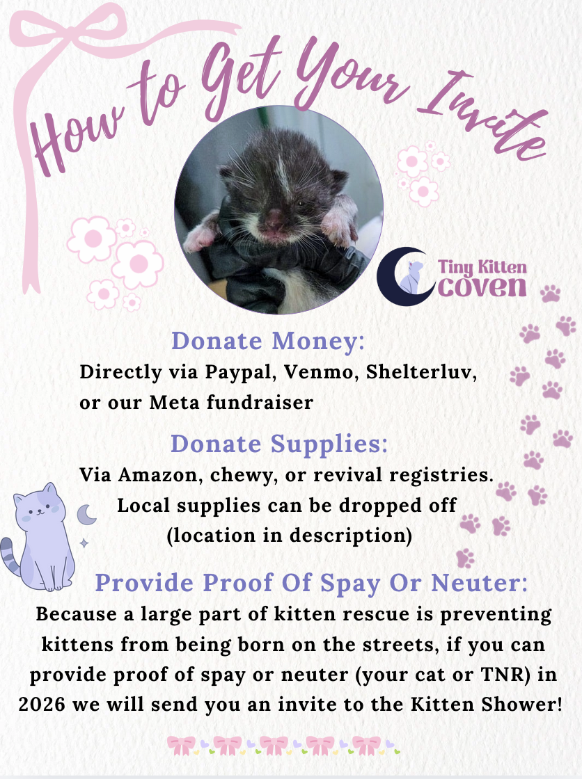 Tiny Kitten Coven is a 501(C)(3) organization, and all donations are tax deductible. EIN 99-4546663.