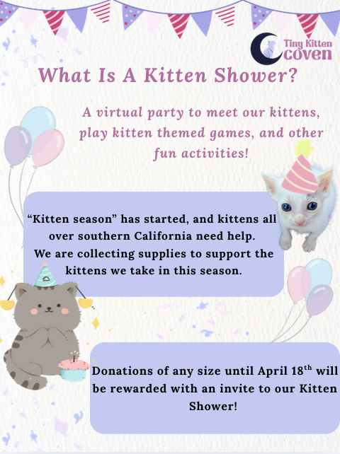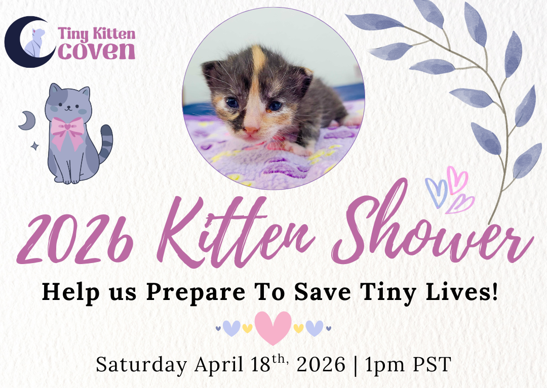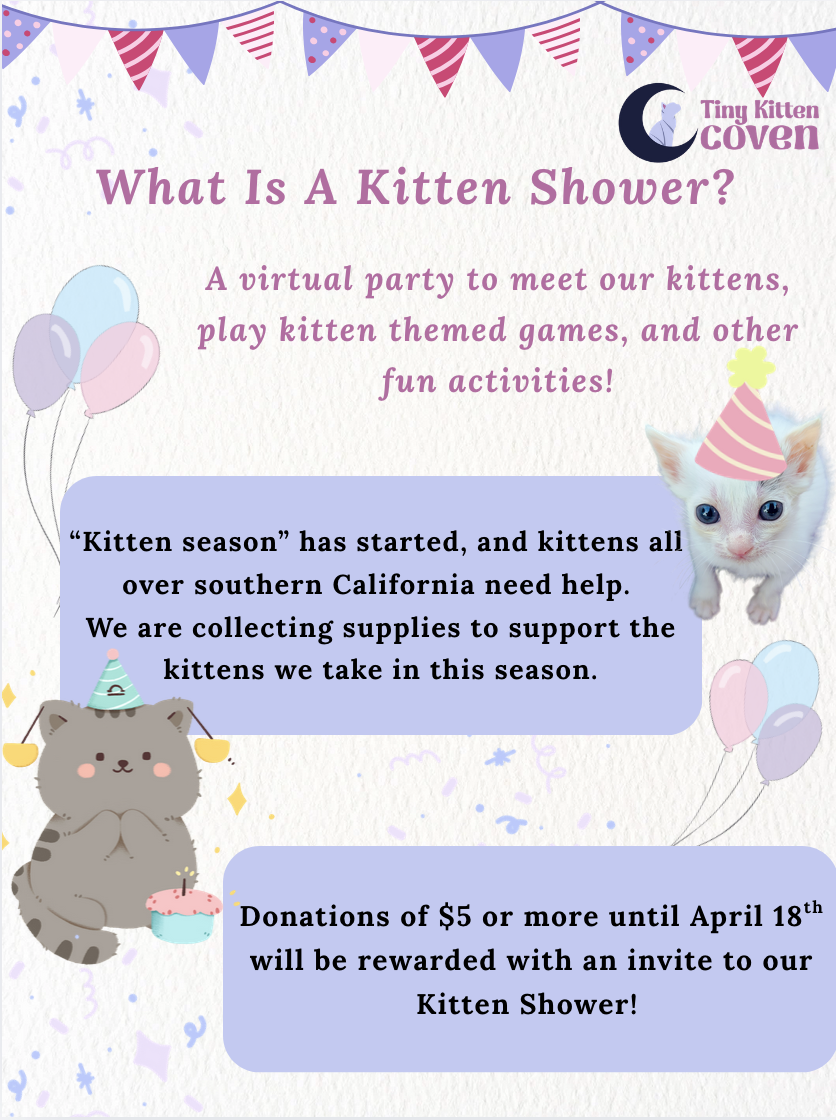 Donate supplies or make a contribution to receive an invitation to our Virtual Kitten Shower on April 18th 2026 at 1pm.