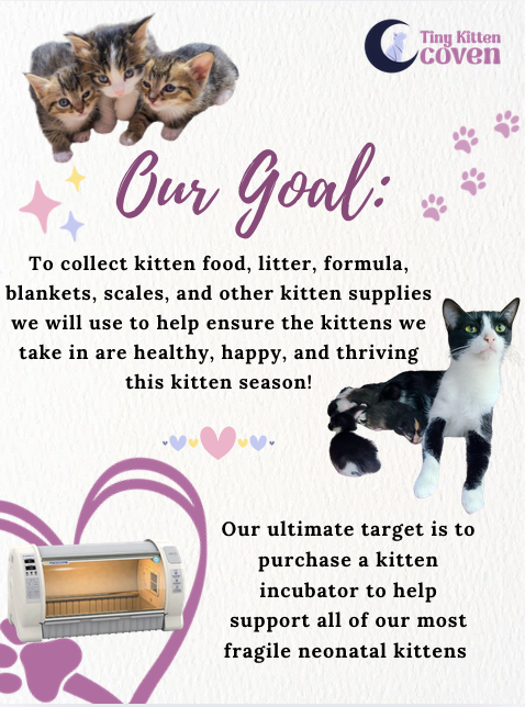 Our biggest goal is to purchase a kitten incubator, which helps regulate temperature and humidity for newborn kittens who are too fragile to survive without extra support.